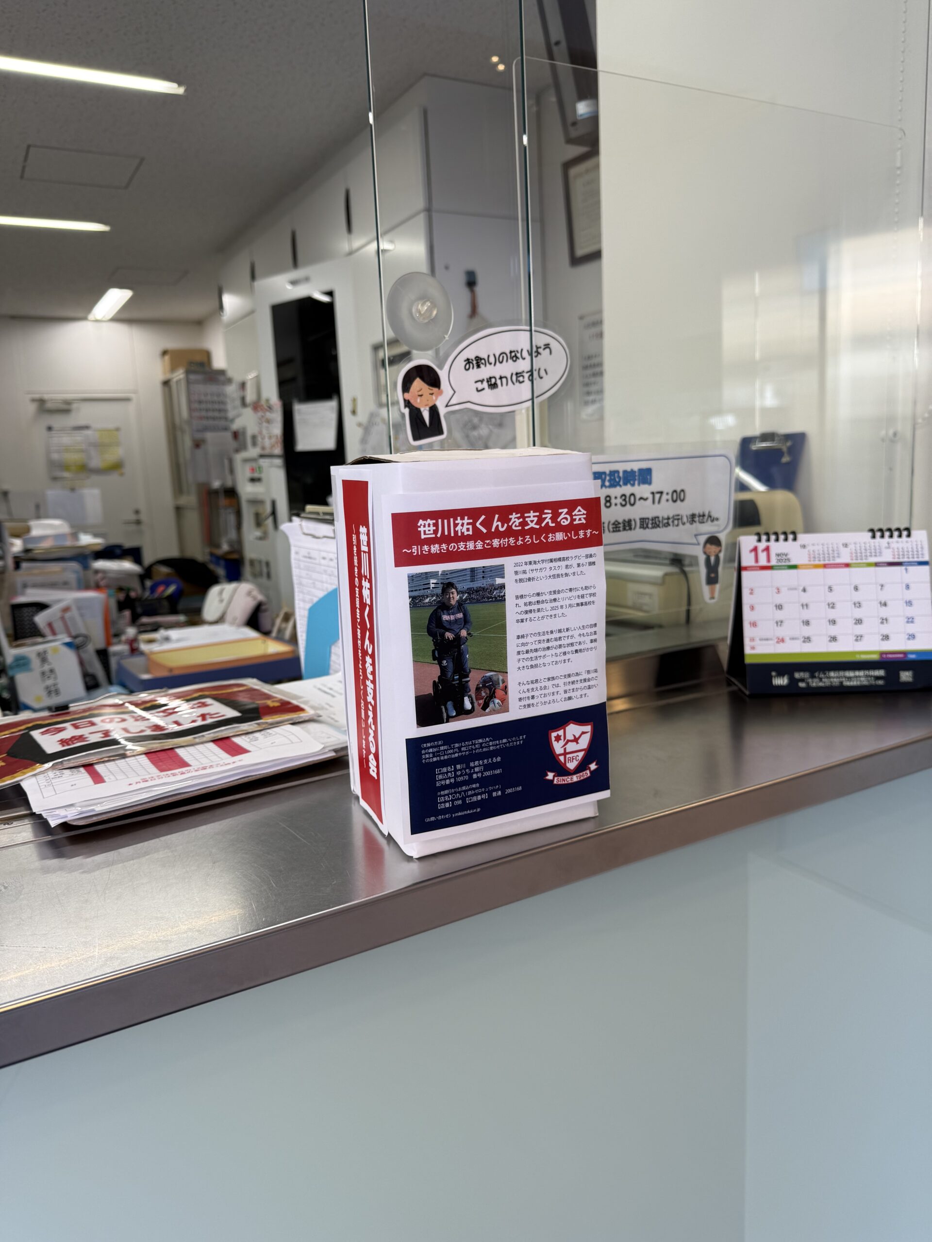現在、各所に多くの募金箱を設置していただき、募金の協力をいただいております。